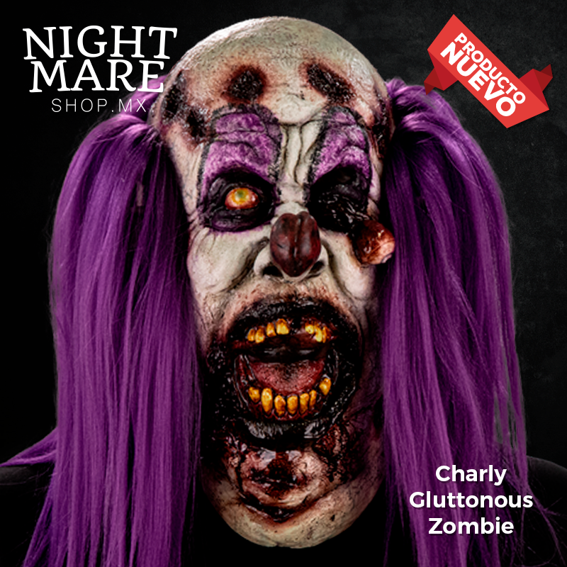 El hambre lo mantiene “vivo”. Charly Gluttonous Zombie es el payaso que jamás deja de masticar. Su rostro es una mezcla de circo barato con banquete de cementerio, con dientes listos para triturar lo que sea. Una máscara diseñada para coleccionistas que disfrutan del detalle repulsivo: encías ennegrecidas, piel colgando y esa expresión de quien moriría feliz… atragantado.